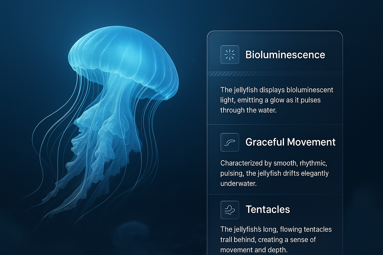 /Collection: /by davooda/Type: PNG/A captivating 3D illustration of a jellyfish pulsing through deep blue water, showcasing bioluminescence. The design features layered elements enhancing the visual depth.