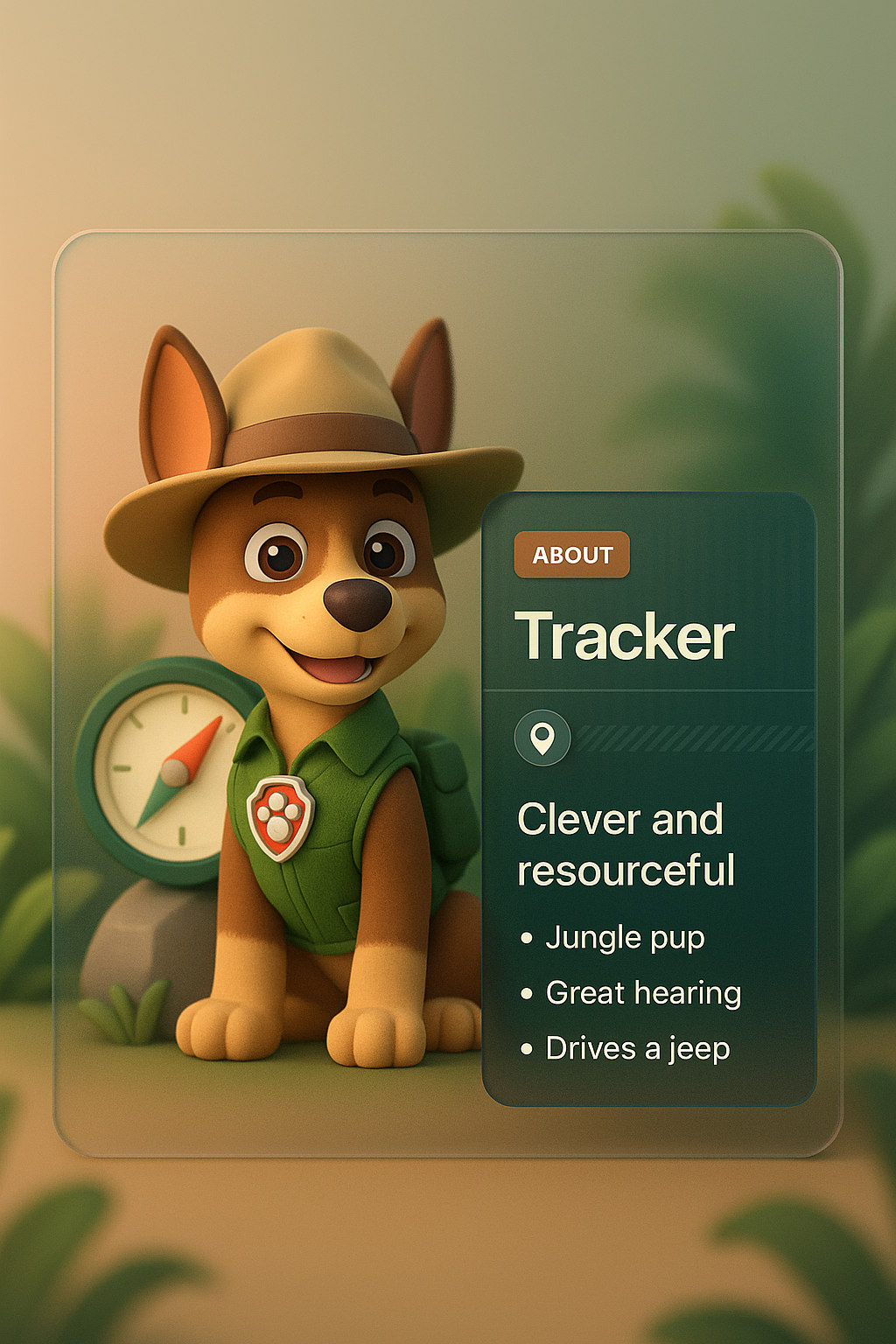 A vibrant 3D illustration of Tracker, a charming jungle pup in a hat, surrounded by a smooth gradient background. The design includes stylish text blocks and icons, emphasizing clarity and creativity.