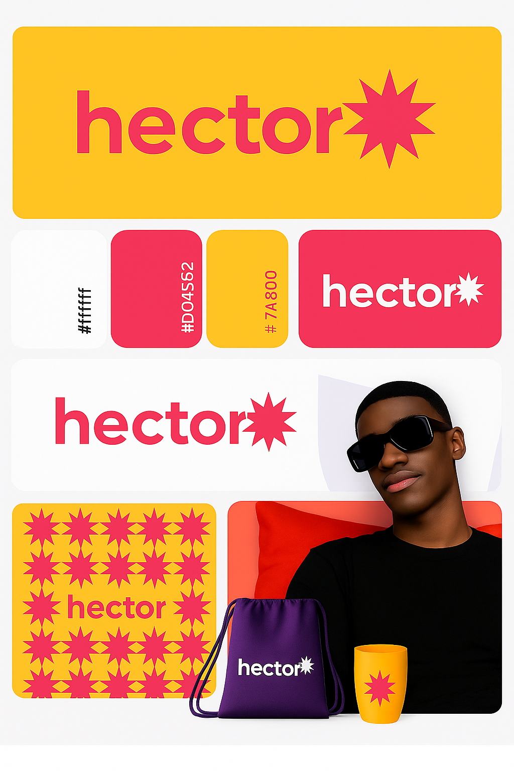 The image showcases a vibrant branding concept featuring the name 'hector' in various designs, colors, and lifestyle elements, promoting a modern aesthetic.