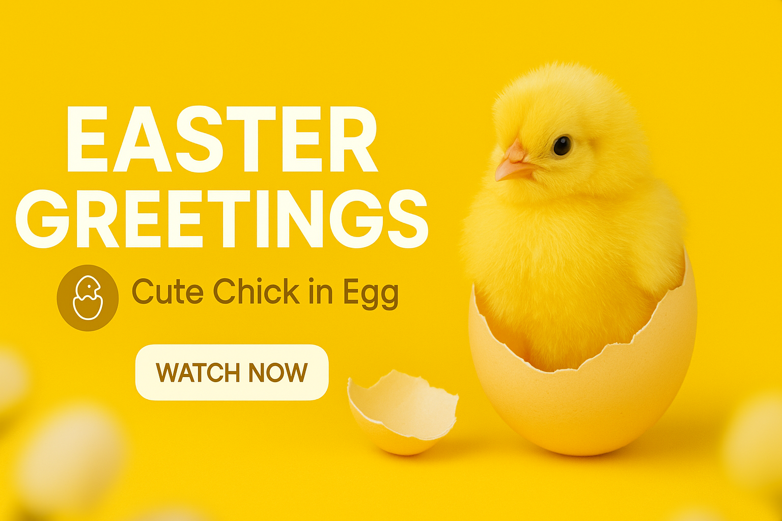 /Collection: /by davooda/Type: PNG/Whimsical Easter greeting image showcasing a cute yellow chick emerging from an egg, set against a bright yellow background. Ideal for festive promotions and social media posts.