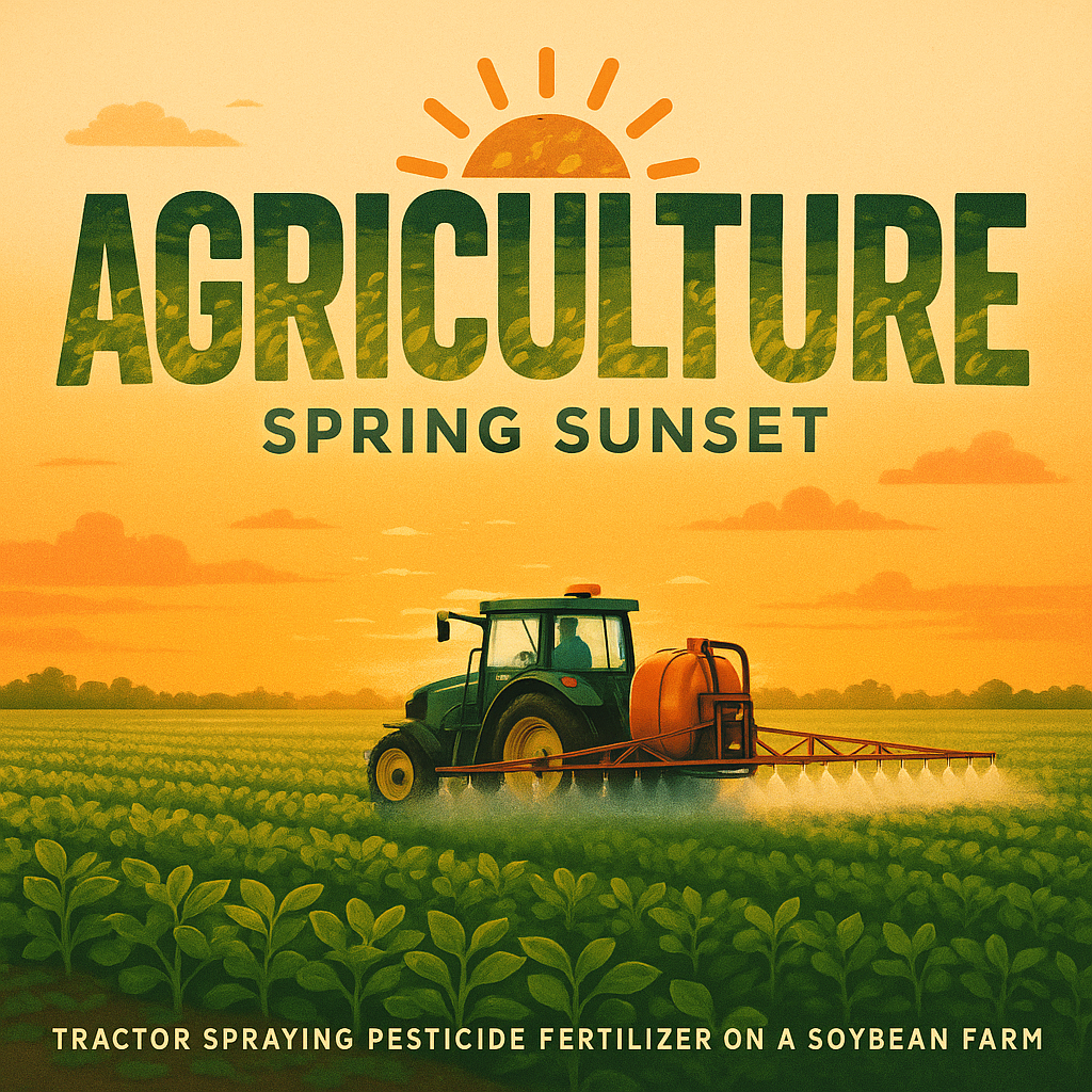 /Collection: /by davooda/Type: PNG/A vibrant illustration depicting a tractor spraying fertilizer on a soybean farm during sunset. The warm color palette and stylized design evoke themes of agriculture and nature, making it suitable for promotional materials in the farming sector.