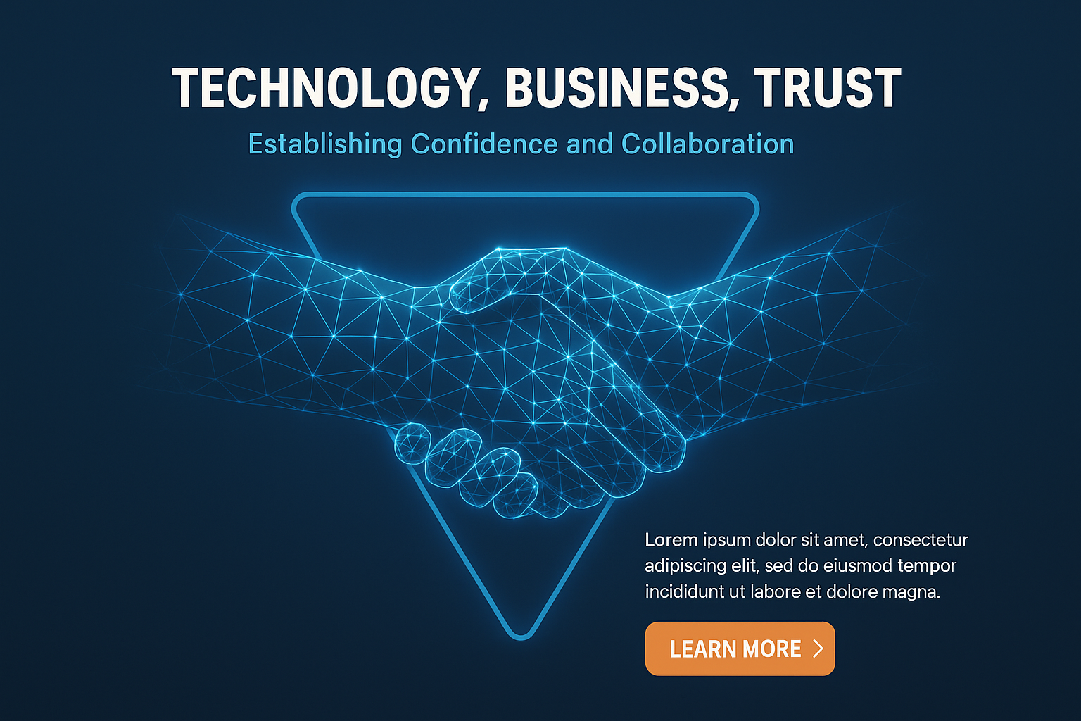 /Collection: /by davooda/Type: PNG/This image features a wireframe illustration of two glowing hands in a handshake, symbolizing trust and collaboration in a technological business context. The design includes a gradient background and additional text elements.