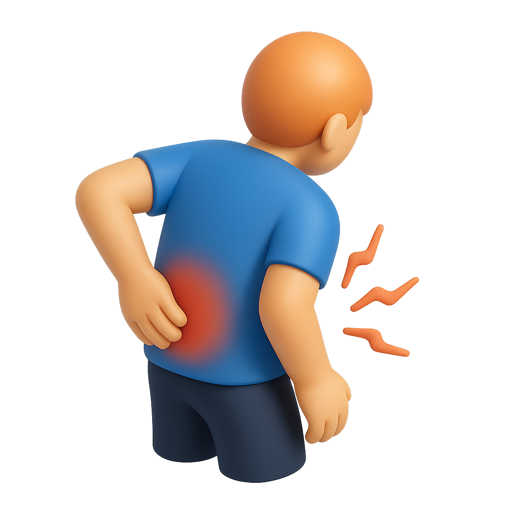 A stylized 3D icon depicting a person experiencing back pain. The figure is shown in a three-quarter view with a blue shirt and dark shorts, emphasizing the pain area with glowing effects.
