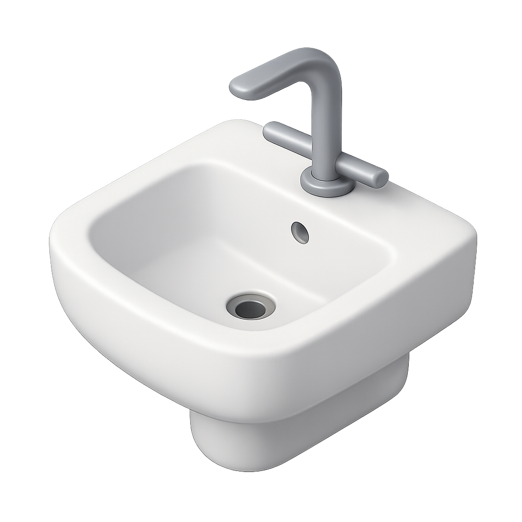 A sleek 3D icon of a basin sink presented in a three-quarter view, featuring a smooth surface and a modern faucet, all set against a transparent background.