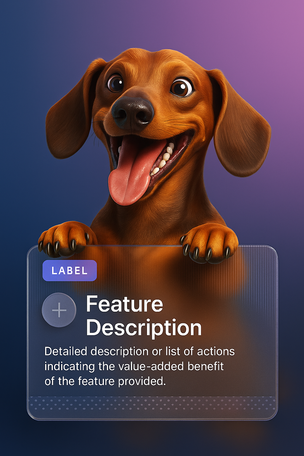 A cheerful dachshund dog is smiling widely, peeking over a transparent panel showcasing a feature description. The background features a smooth gradient, enhancing the playful vibe.
