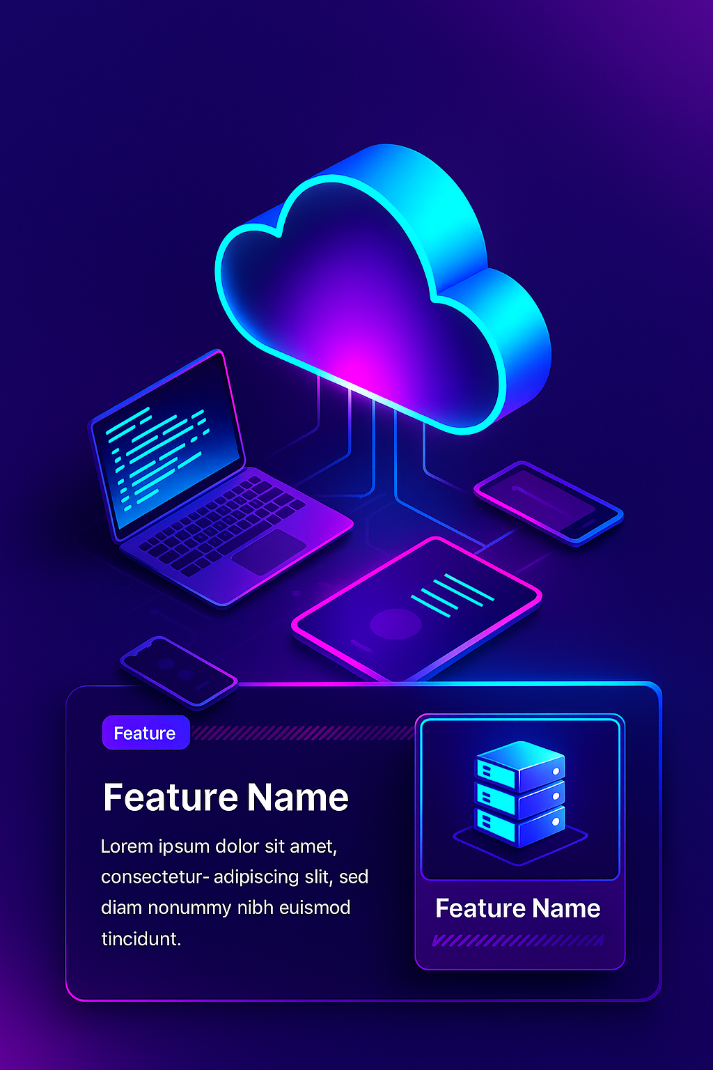 /Collection: /by davooda/Type: PNG/A vibrant isometric illustration showcasing modern cloud technologies. Features devices like a laptop, tablet, and smartphone, all connected to a glowing cloud icon. The design uses neon colors against a dark background.