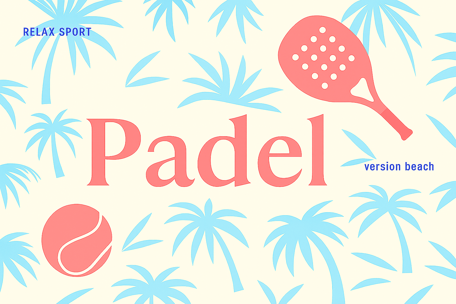 A vibrant graphic featuring the word 'Padel' in a playful font with palm trees and sports equipment, emphasizing a relaxed beach atmosphere.