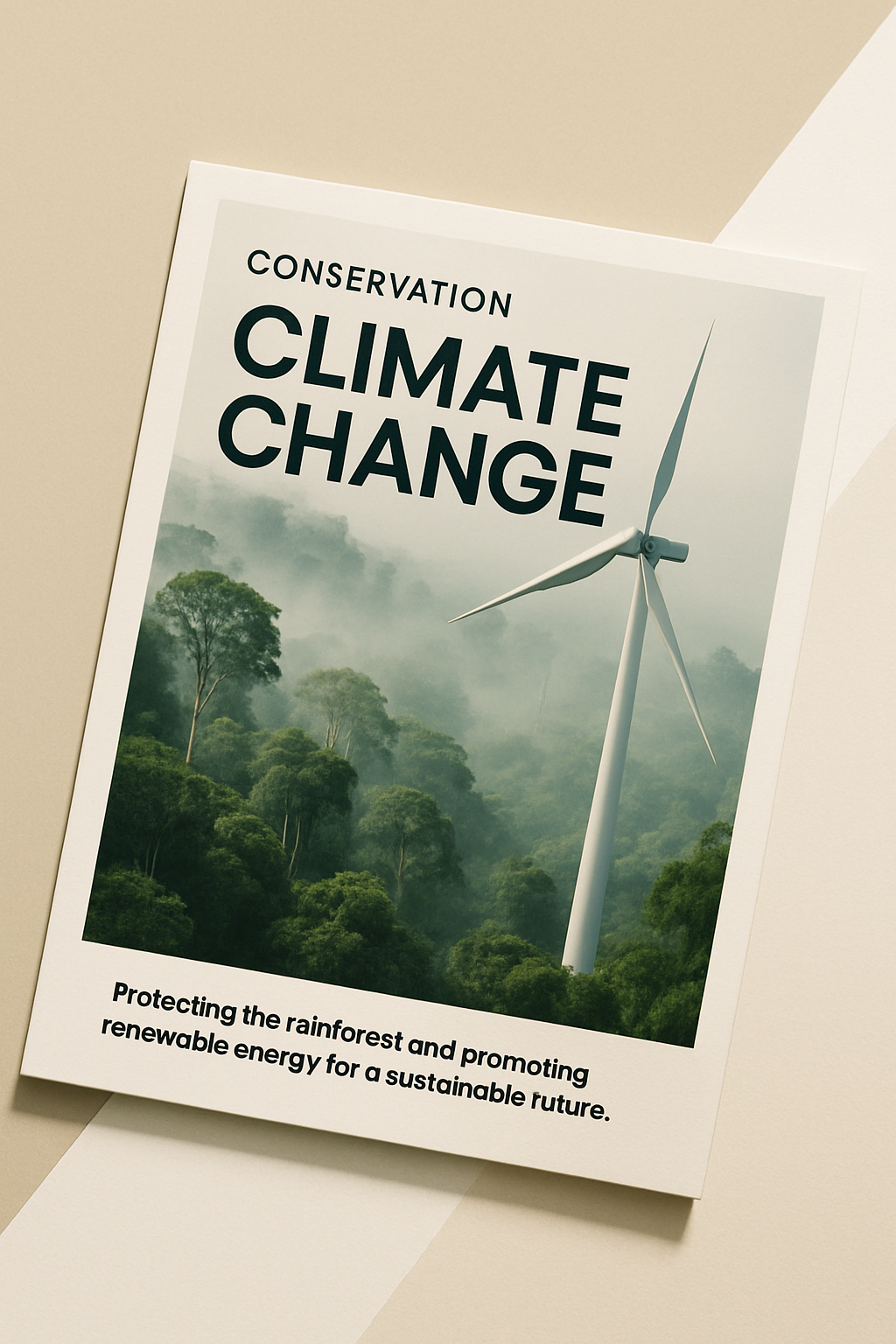 A modern advertisement promoting rainforest conservation and renewable energy. It features a wind turbine amidst a foggy rainforest landscape, emphasizing climate change themes.