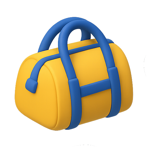 A vibrant 3D illustration of a yellow duffle bag accented with blue straps, suitable for use in travel-related graphics or promotional materials.