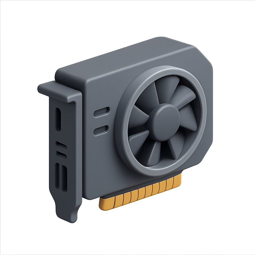 A detailed 3D representation of a GPU icon, featuring a fan and a gold connector. The design showcases a three-quarter view with a transparent background, emphasizing its volumetric and isometric qualities.