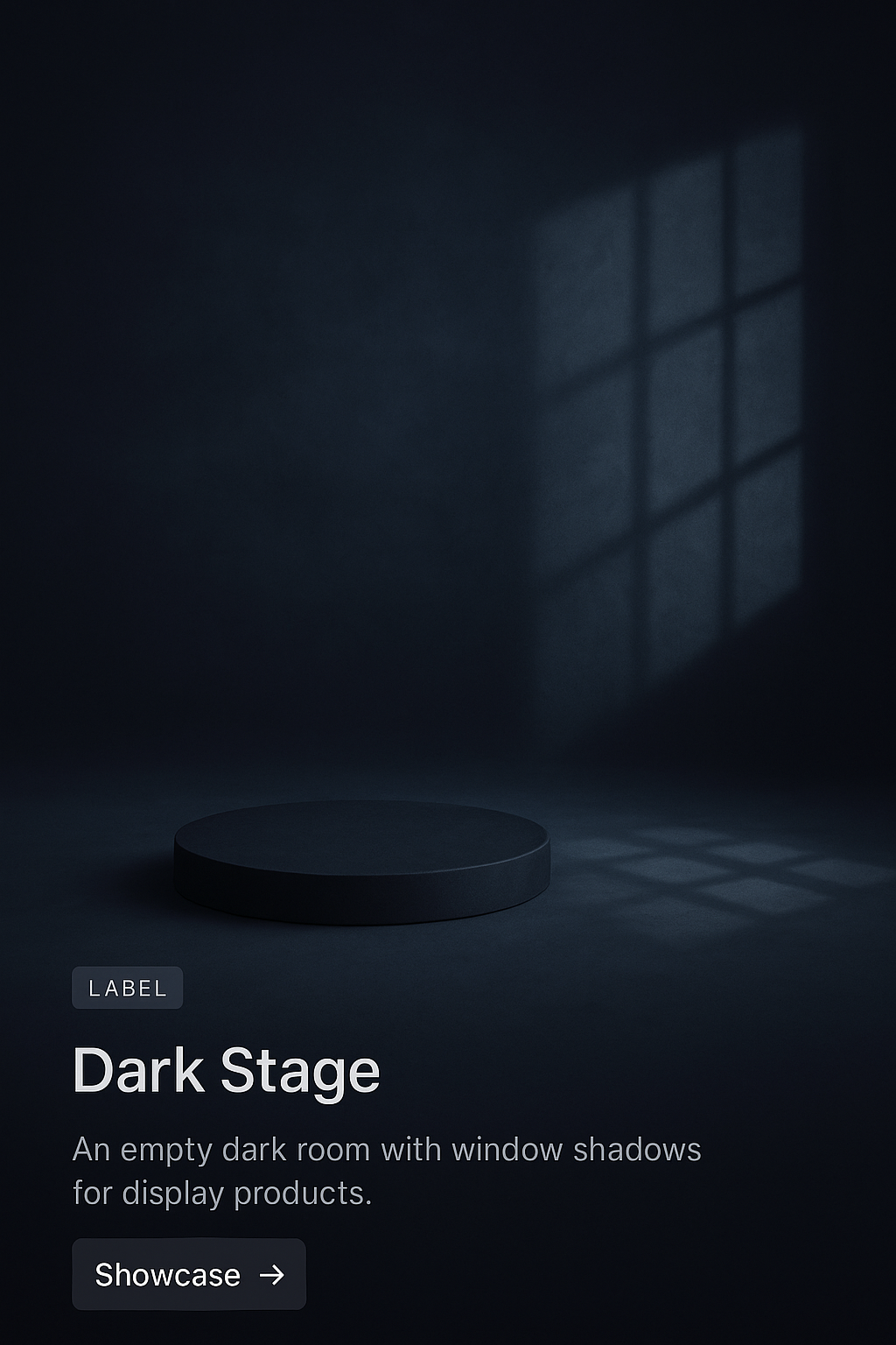 /Collection: /by davooda/Type: PNG/A dark room featuring a smooth gradient background with shadows from windows. The scene includes a circular display platform and minimal text elements, creating a focused atmosphere for showcasing products.