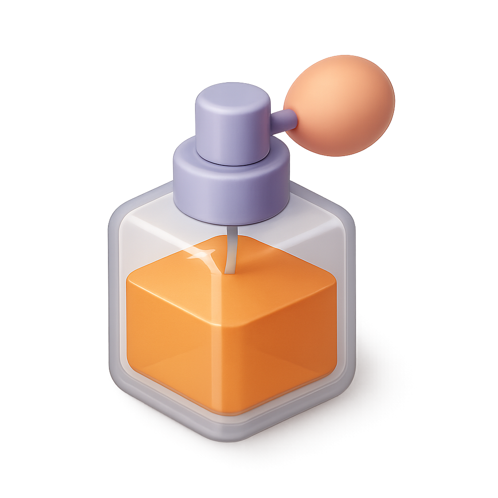 /Collection: /by davooda/Type: PNG/A stylized 3D icon of a perfume bottle featuring a transparent container with an orange cube inside. The bottle has a purple cap and a round pink puff, showcasing a modern and playful design.