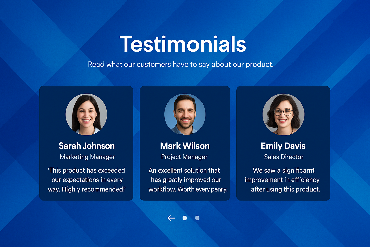This image features a testimonials section with three cards displaying author photos, names, positions, and testimonial texts. The background is a dynamic blue geometric design.