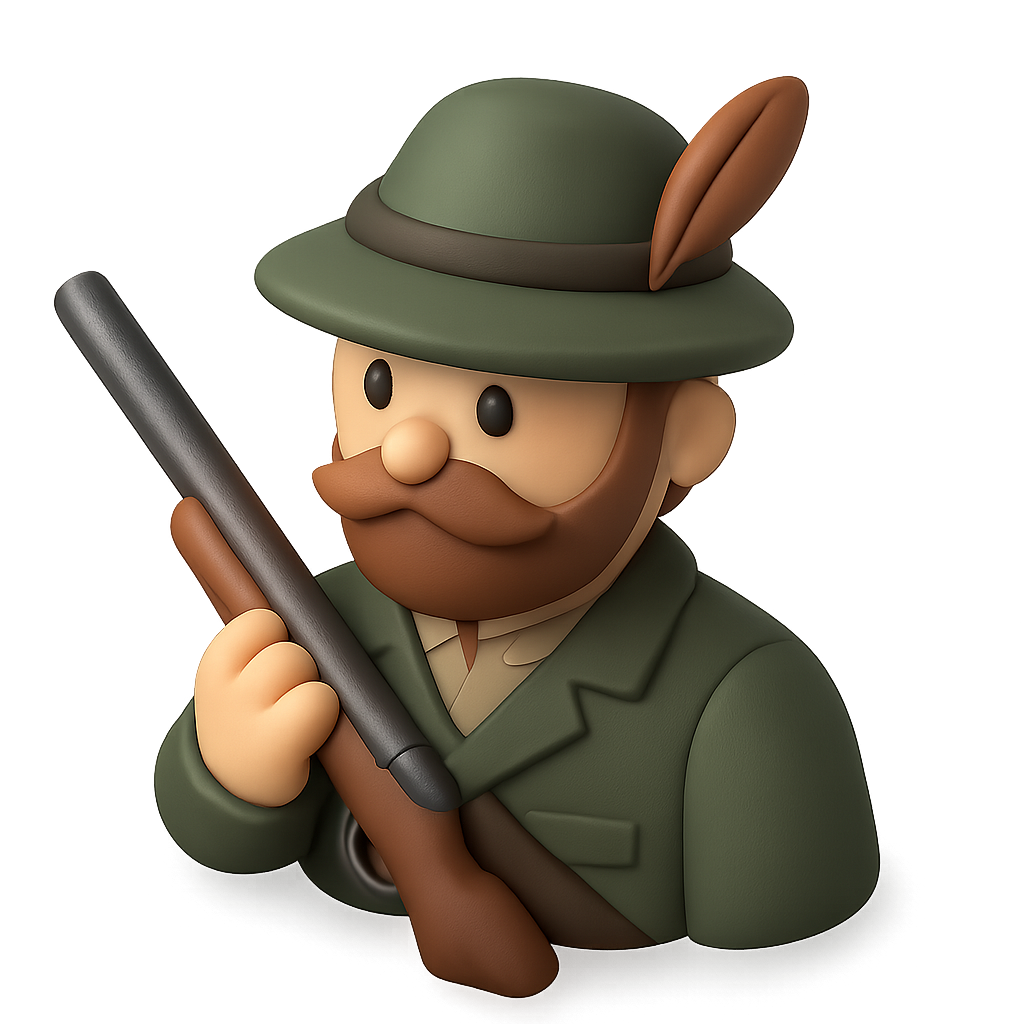 A stylized 3D icon of a German hunter holding a rifle, featuring a green outfit and a hat with an ear. The design has a playful, cartoonish look with a transparent background.