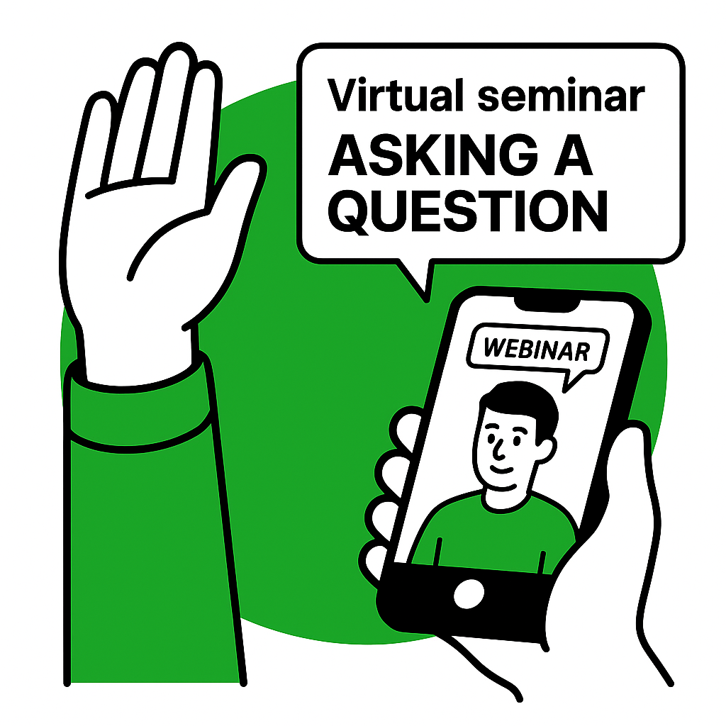 /Collection: /by davooda/Type: PNG/A modern illustration depicting a virtual seminar scenario where a participant is asking a question via a smartphone. The design features bold lines and vibrant colors, ideal for educational or promotional materials.