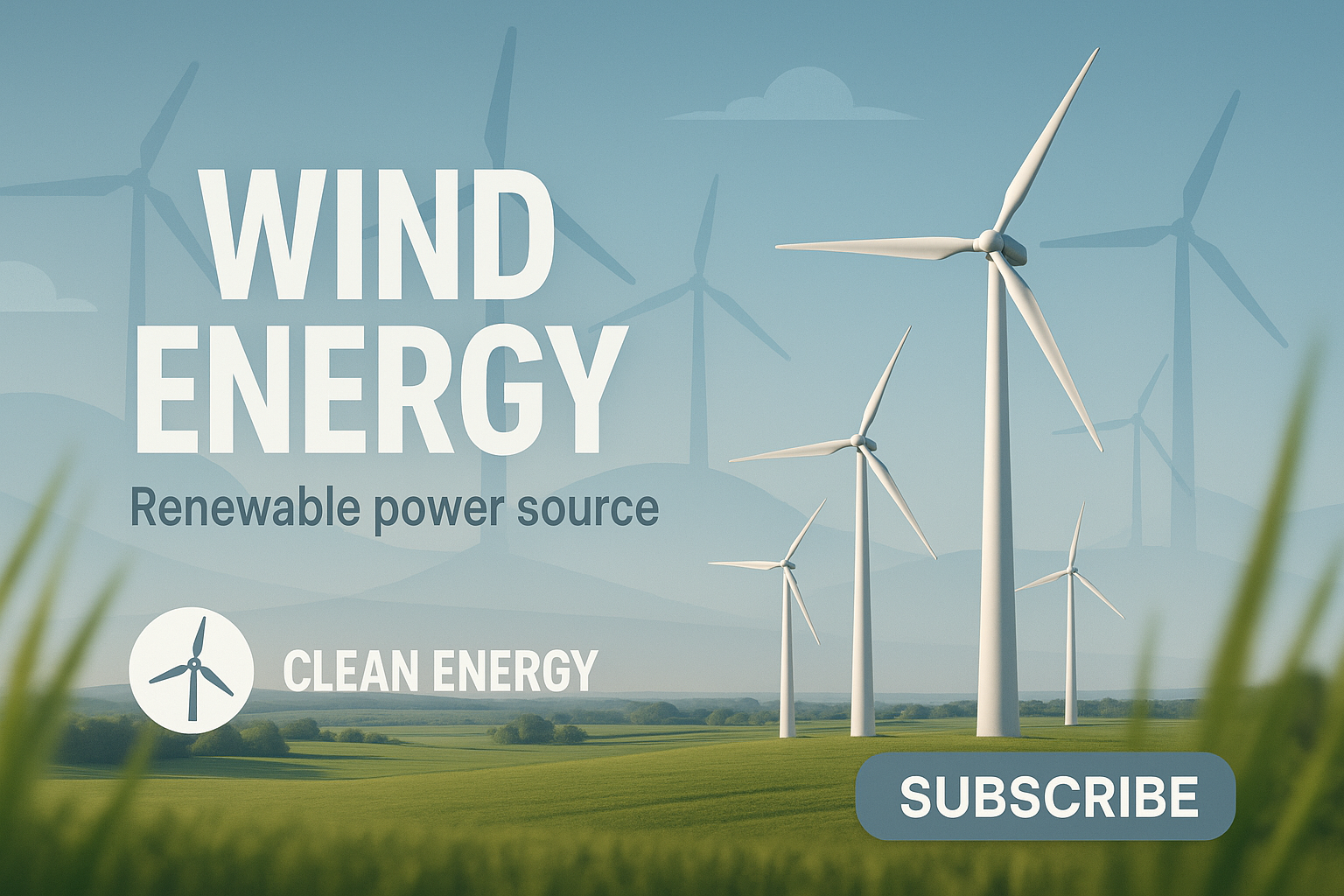 Vibrant graphic showcasing wind turbines against a serene landscape, designed to promote clean energy awareness. Ideal for environmental campaigns and educational content.