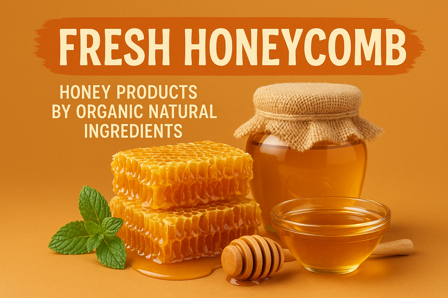 Vibrant product display featuring fresh honeycomb, honey jar, and natural ingredients, ideal for organic food marketing and branding.