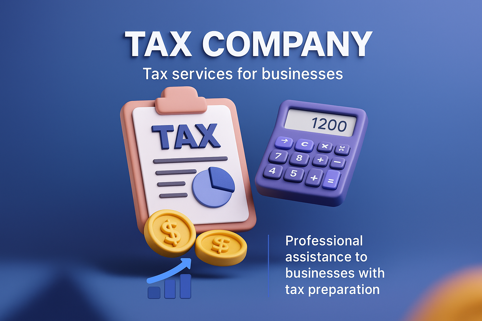 A vibrant 3D illustration featuring a tax document, calculator, and dollar coins, designed for a tax services company. The composition emphasizes clarity and professionalism.
