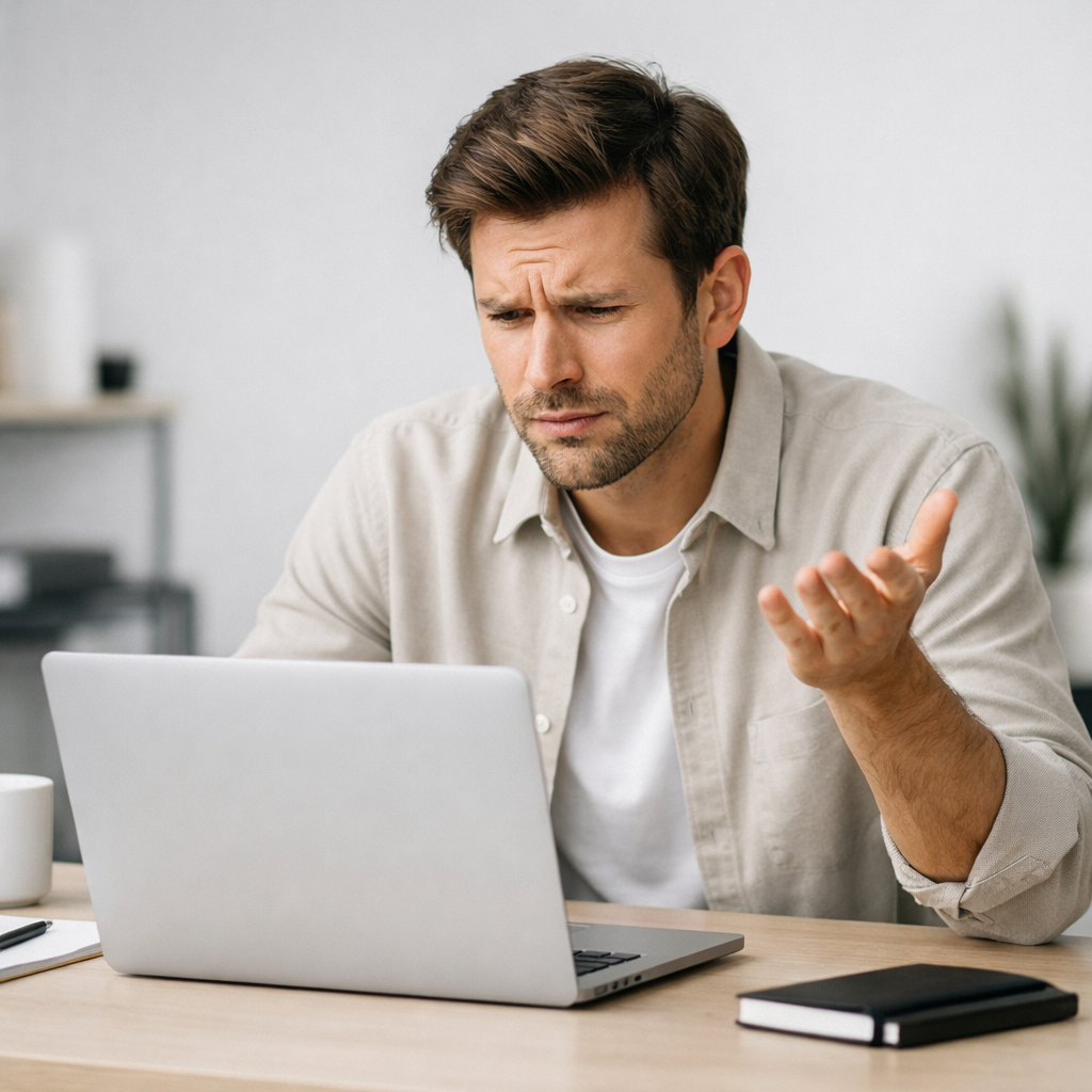 A Caucasian man in casual office attire is seated at a desk, looking perplexed while staring at his laptop. His expression shows confusion, adding a relatable touch to the workspace scene.