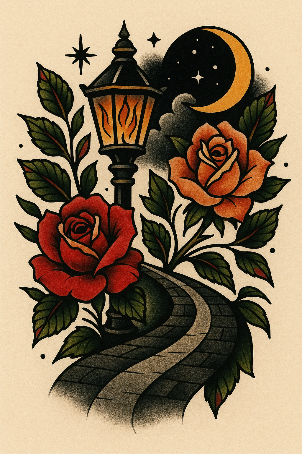 /Collection: /by davooda/Type: PNG/This is a tattoo design featuring a vintage lantern beside vibrant roses, set against a night sky. The bold colors and classic style appeal to tattoo enthusiasts.