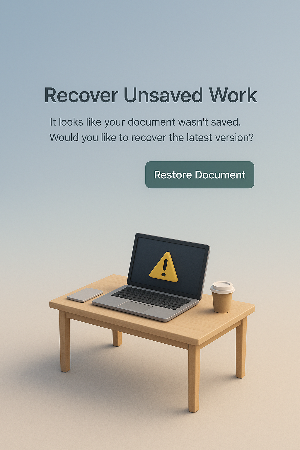 A realistic 3D scene depicting a laptop on a table, showing an unsaved work alert. The gradient background enhances the focus on the laptop and the coffee cup.