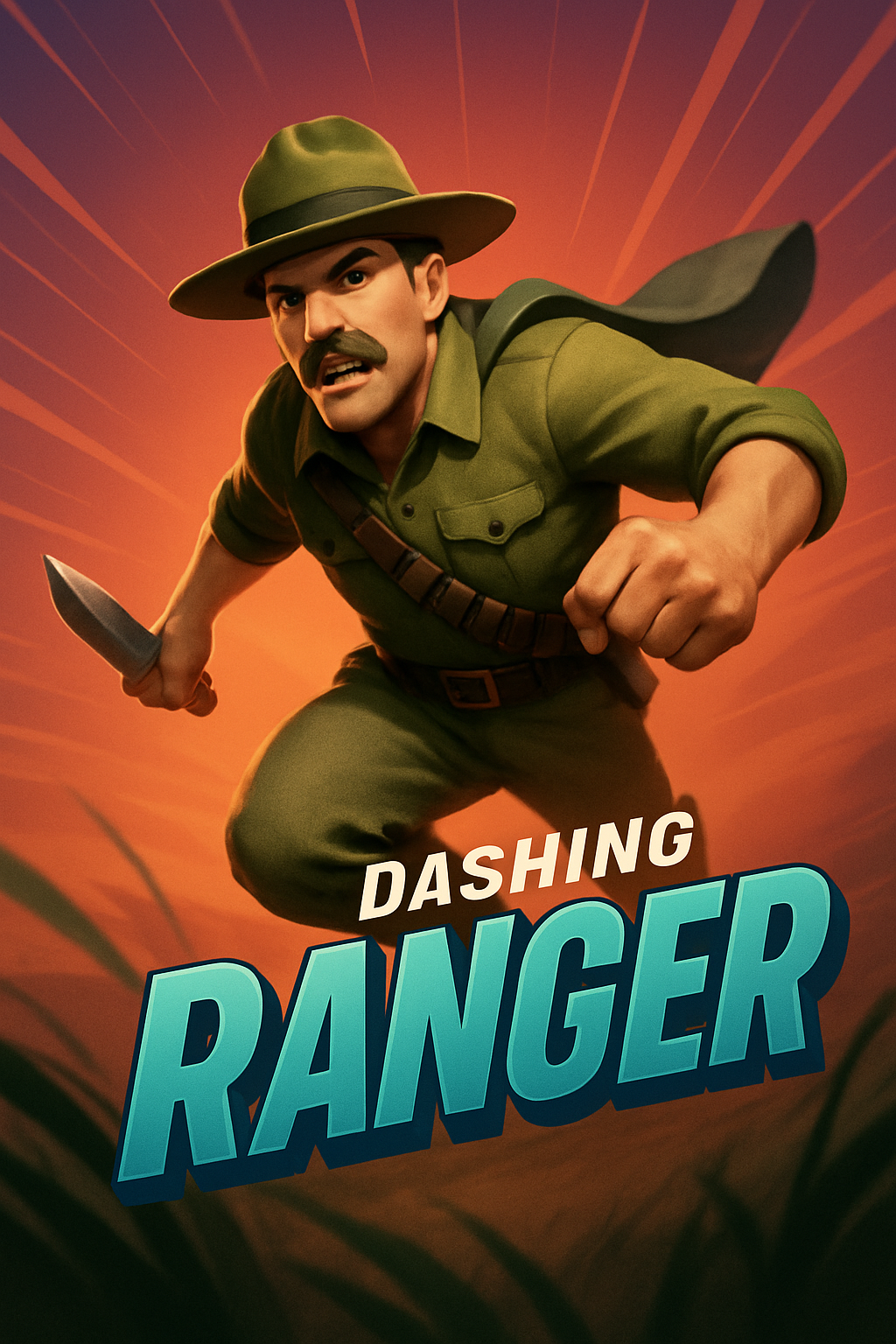 A dynamic illustration of a ranger in action, wielding a knife with a determined expression. The background features a smooth gradient with rays radiating from the center, enhancing the sense of motion.