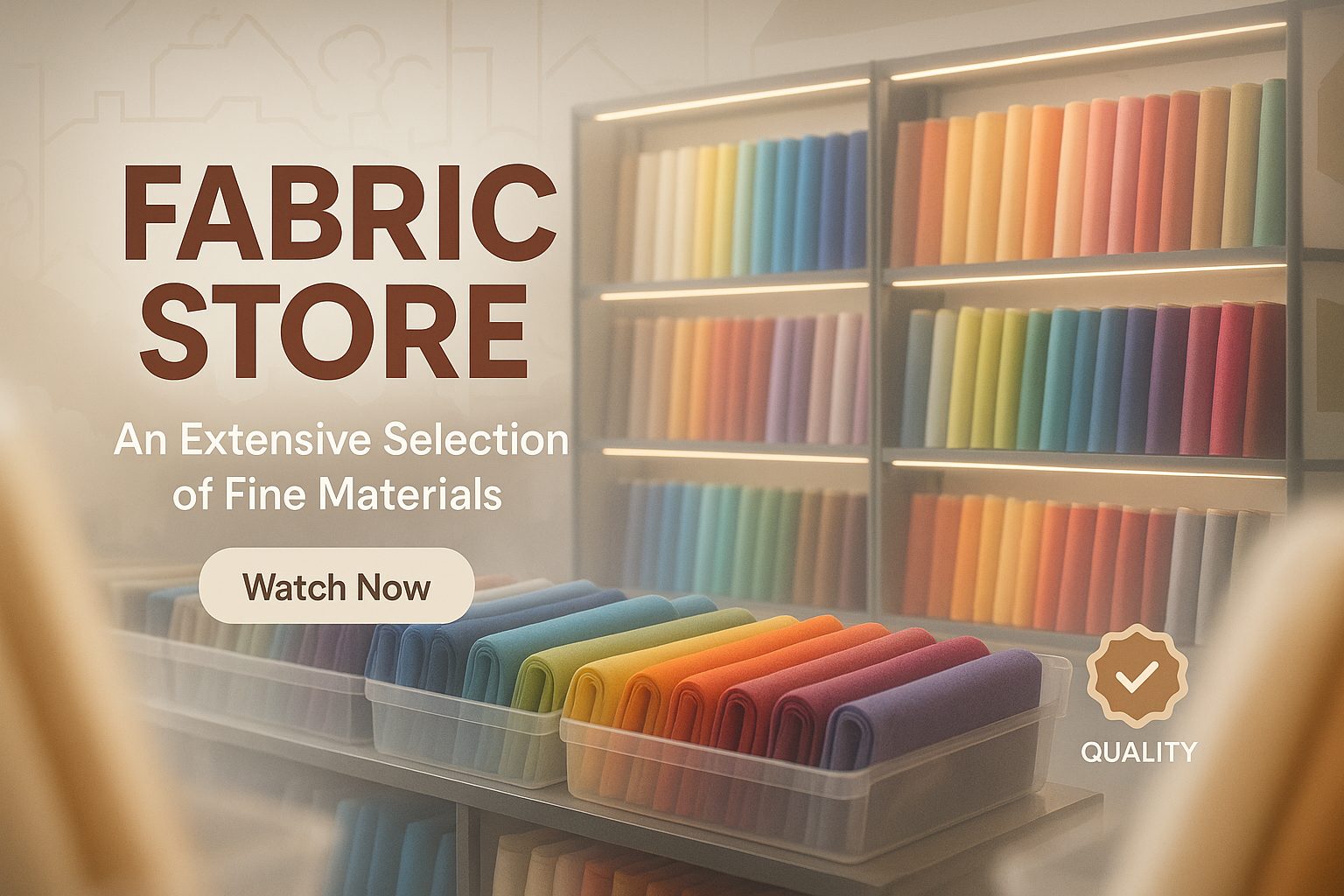 Promotional Graphic for Fabric Store Featuring Colorful Material Display