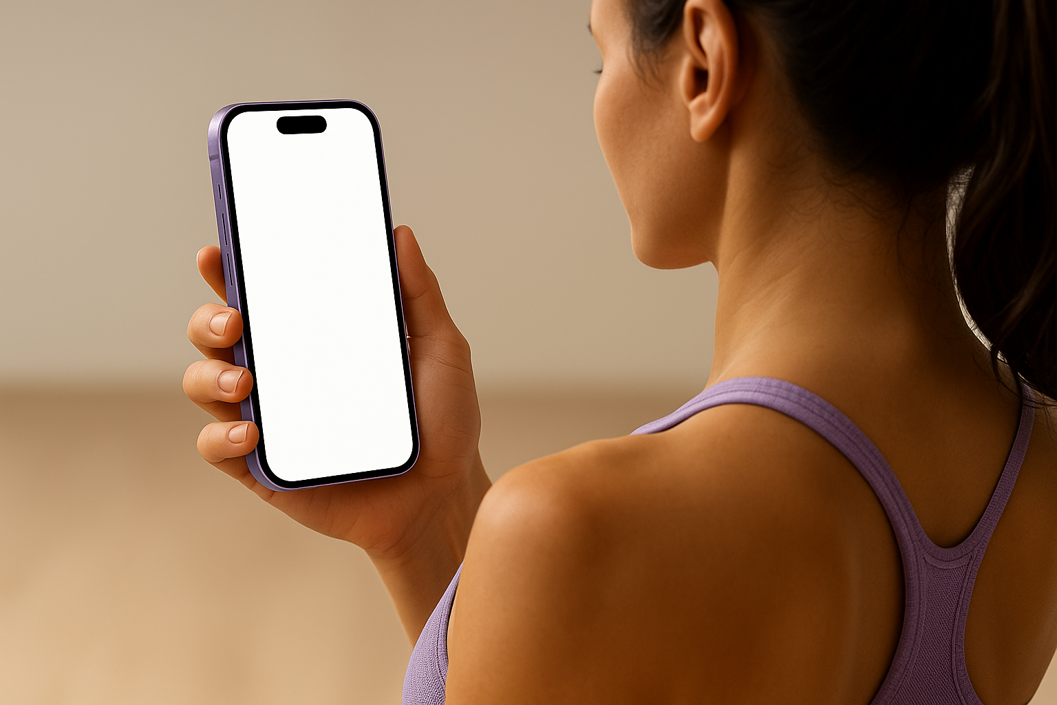A female yoga instructor in athletic wear holds a purple phone displaying a blank screen. The image captures a dynamic angle from behind, emphasizing the graceful posture.