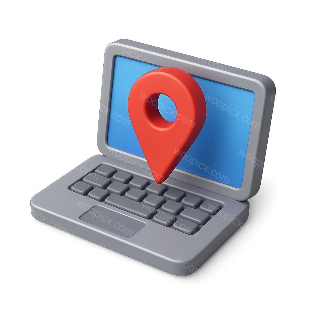 /Premium/Collection: /by davooda/Type: PNG/A 3D icon depicting a laptop with a prominent red location marker on its screen, designed in a three-quarter isometric view, featuring a volumetric style.