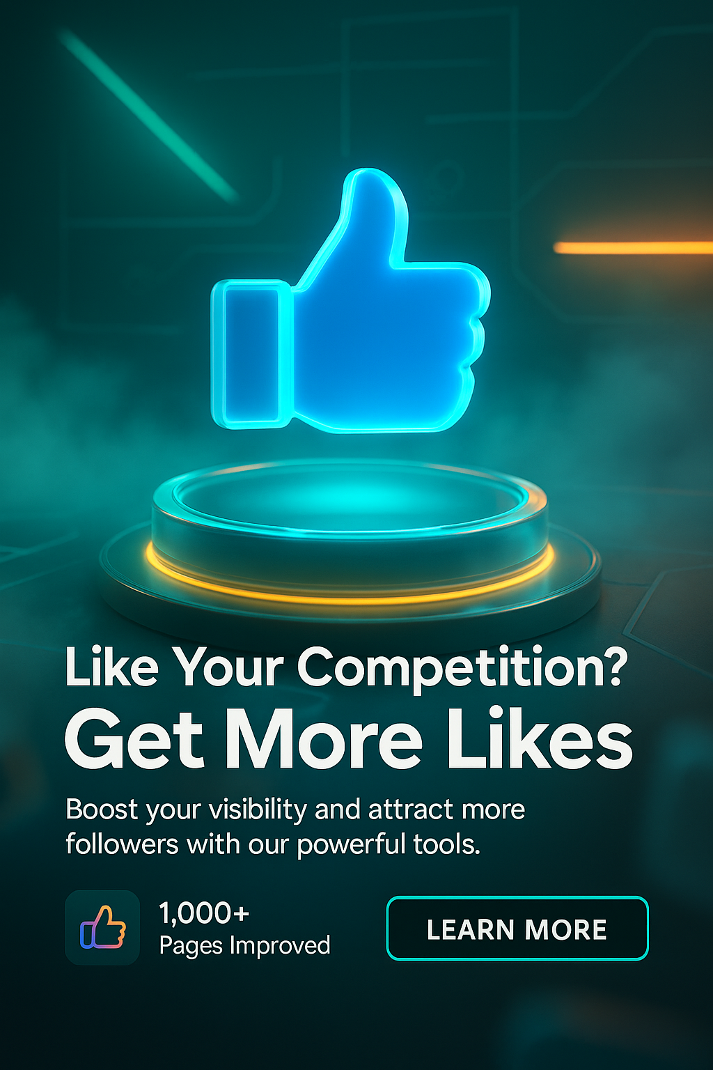 /Collection: /by davooda/Type: PNG/Vibrant promotional graphic designed to attract social media engagement, featuring a glowing thumbs-up icon and modern typography, ideal for digital marketing campaigns.