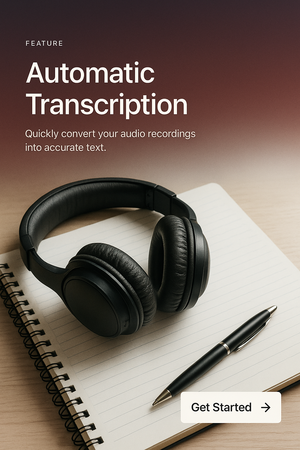 /Collection: /by davooda/Type: PNG/A stylish web page design showcasing automatic transcription. It features black headphones resting on a notebook with a pen, highlighting clarity and functionality.