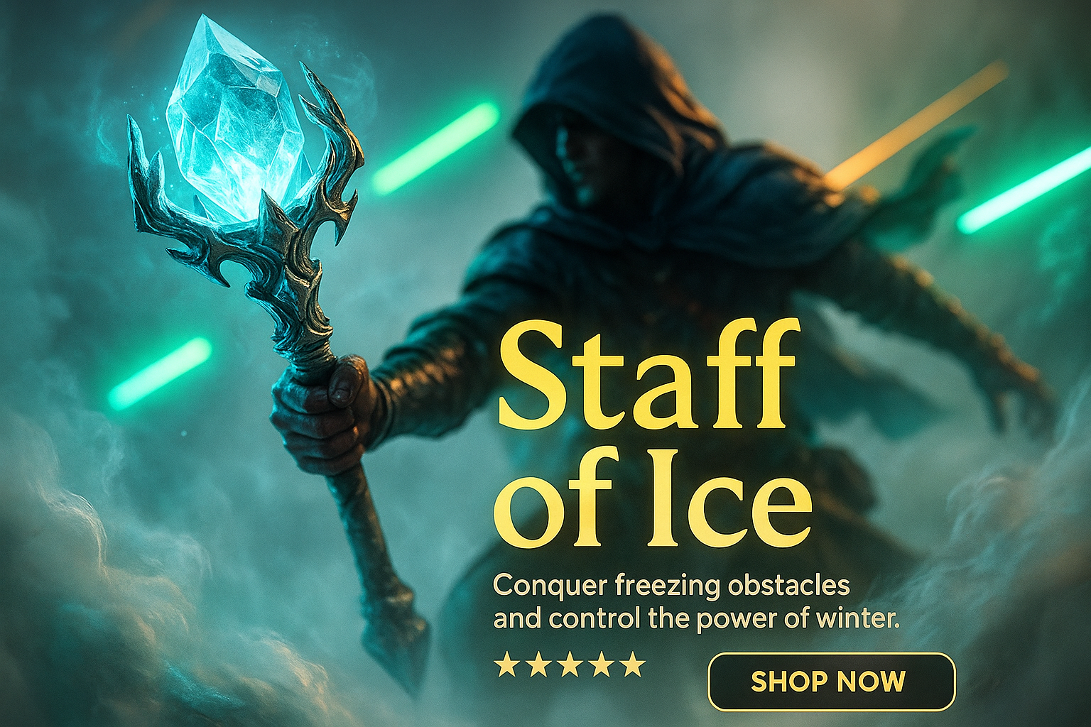 A vibrant carousel slide featuring a glowing ice staff, highlighting its magical properties. The scene is layered with text and neon accents for depth and visual appeal.