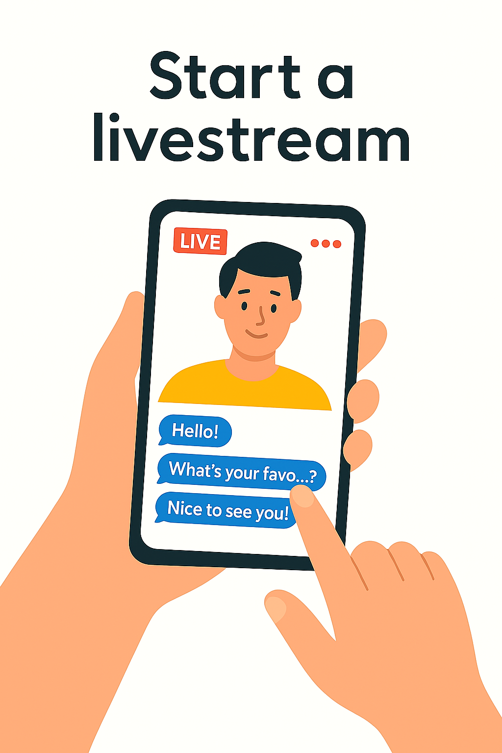 A vibrant graphic depicting a user starting a livestream on a mobile device, featuring chat interactions. Ideal for social media or digital marketing contexts.