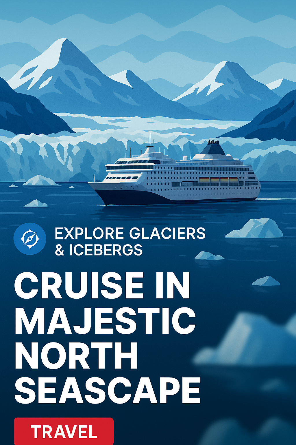 Stylized travel poster showcasing a cruise ship amidst majestic glaciers and icebergs, designed to inspire adventure and exploration in a serene seascape.