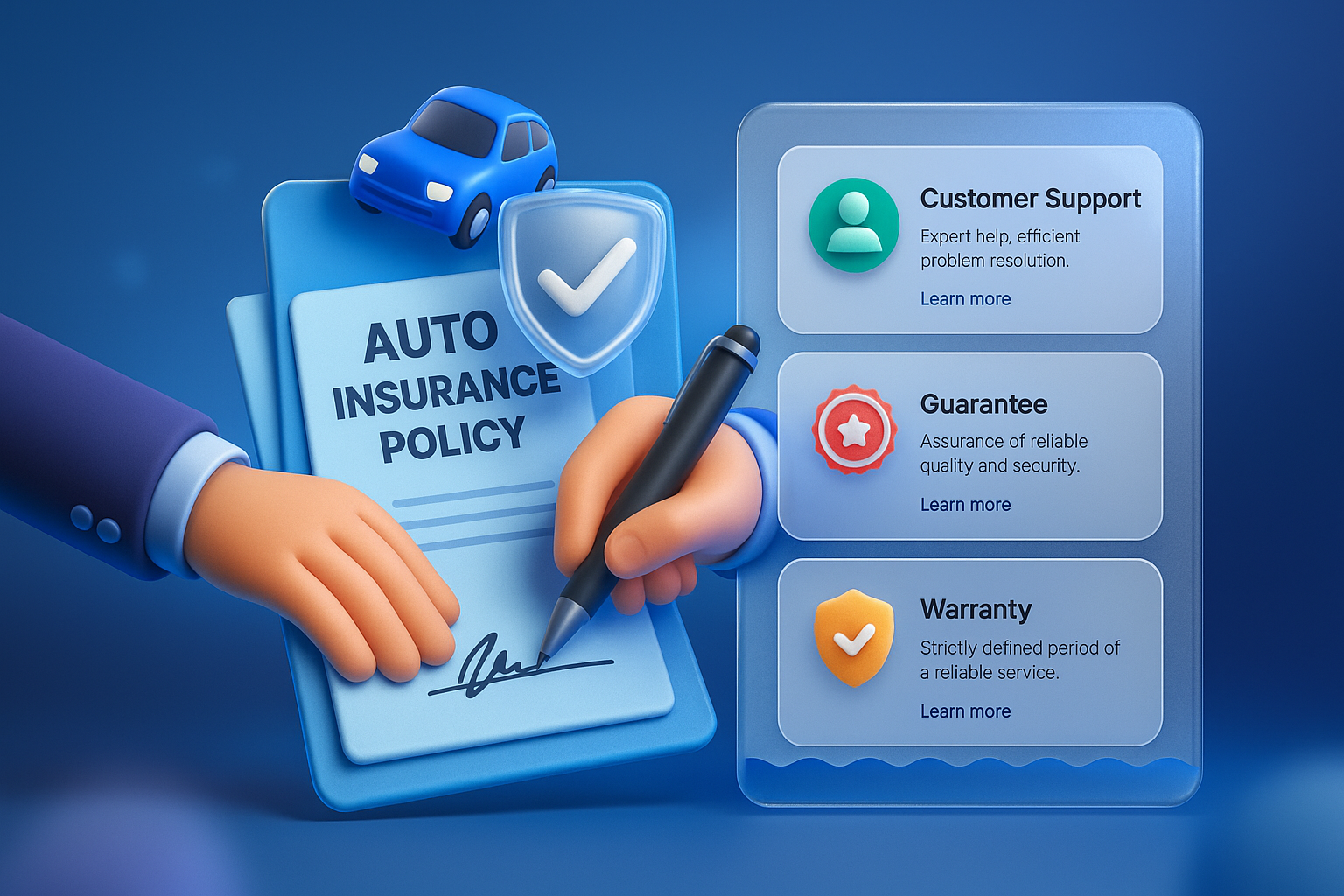 /Collection: /by davooda/Type: PNG/A vivid 3D illustration showcasing an auto insurance policy being signed. Features include customer support, guarantee, and warranty details, all designed with a cohesive visual style.