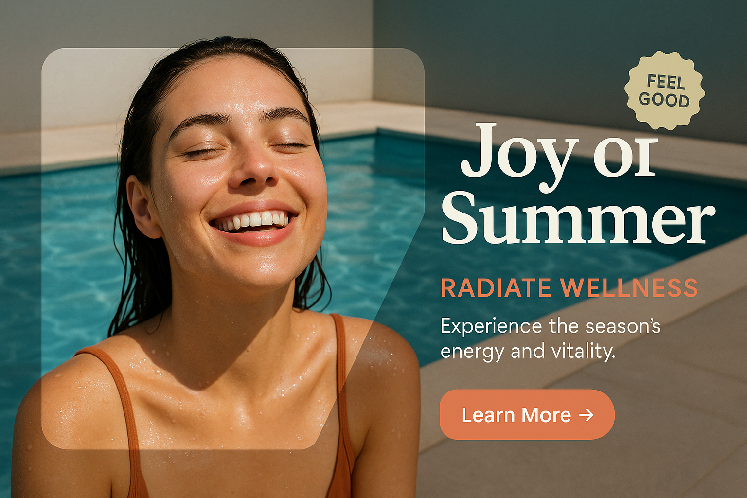 A radiant woman with dewy skin enjoys a summer day by the pool, exuding happiness and vitality. The design features a harmonious layout with engaging text elements.