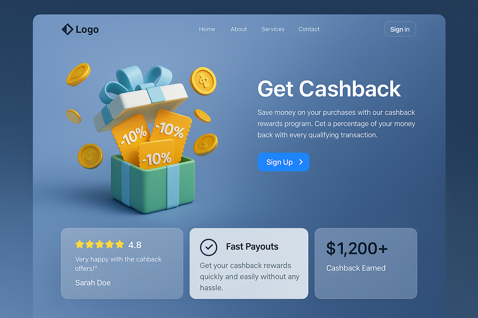 /Collection: /by davooda/Type: PNG/A visually appealing 3D landing page mockup showcasing a gift box with coupons and flying coins, emphasizing cashback offers. The design includes sections for features and testimonials.
