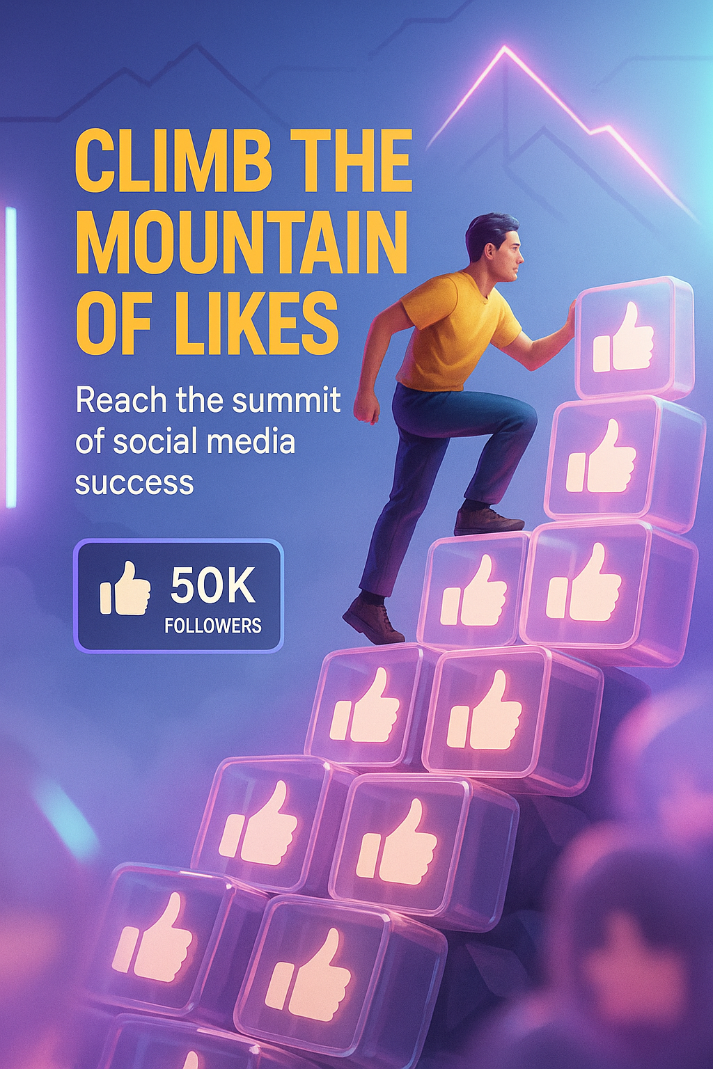 Dynamic motivational graphic illustrating a person climbing a mountain of likes, symbolizing social media success. Ideal for social media marketing campaigns.