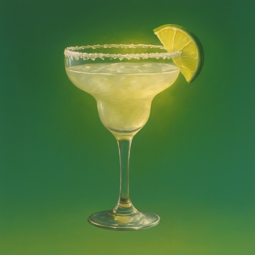 /Collection: /by davooda/Type: PNG/A beautifully rendered realistic image of a margarita glass filled with a light yellow drink, garnished with a lime slice, set against a smooth green background.