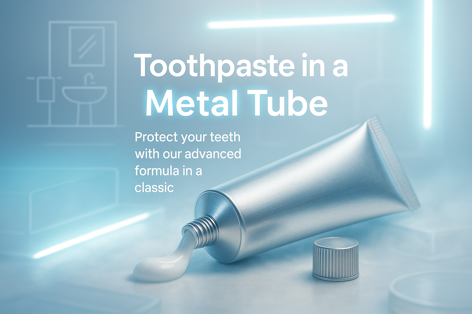 A sleek product image of toothpaste in a metal tube, showcasing a modern aesthetic. Ideal for dental care marketing and e-commerce displays.