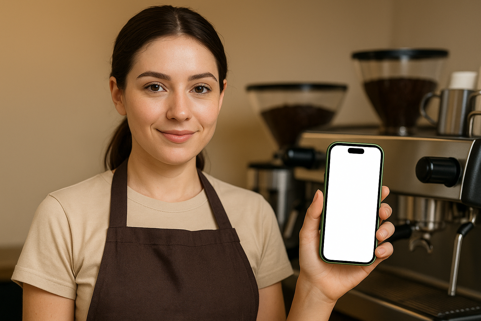 A barista in an apron smiles while holding a green phone with a blank screen near a coffee machine. The setting is warm and inviting, reflecting a coffee shop ambiance.