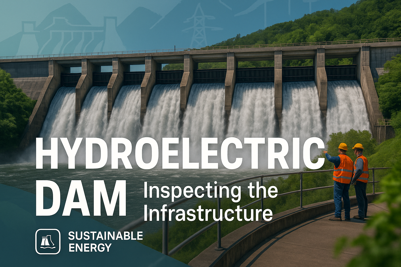 Informative image showcasing a hydroelectric dam with inspectors, designed for educational or promotional purposes related to sustainable energy and infrastructure.