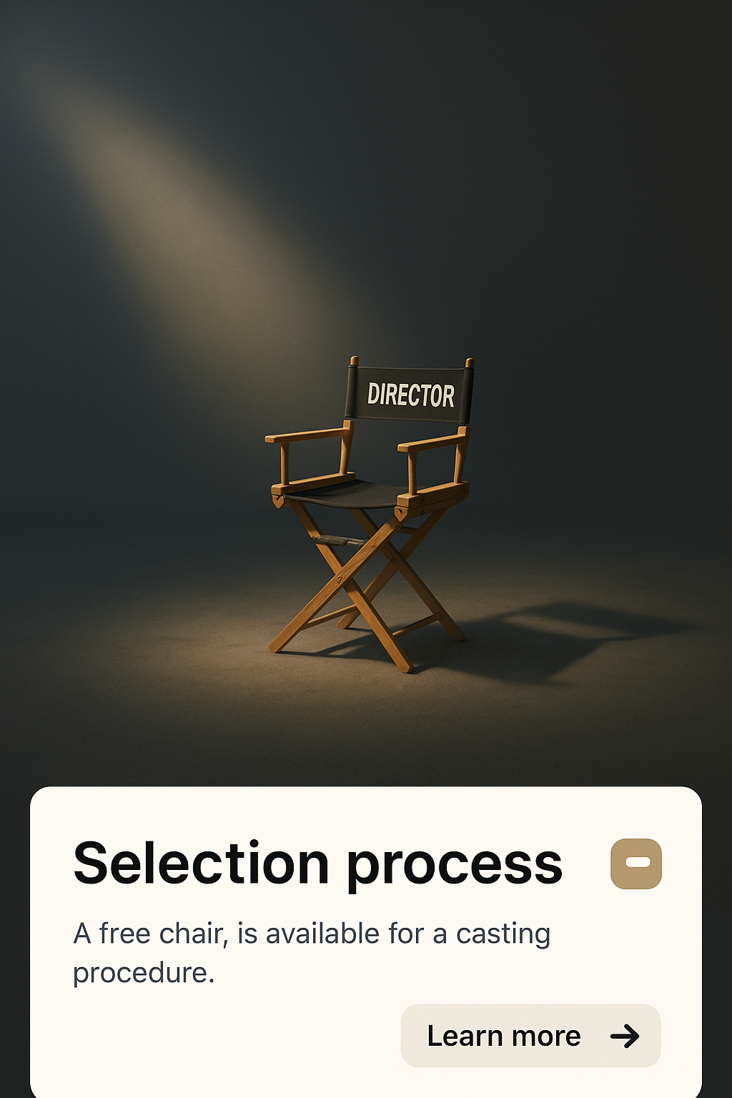 /Collection: /by davooda/Type: PNG/A director's chair illuminated by a spotlight in a shadowy setting, emphasizing the casting process. The scene includes a subtle gradient background and a text block inviting action.