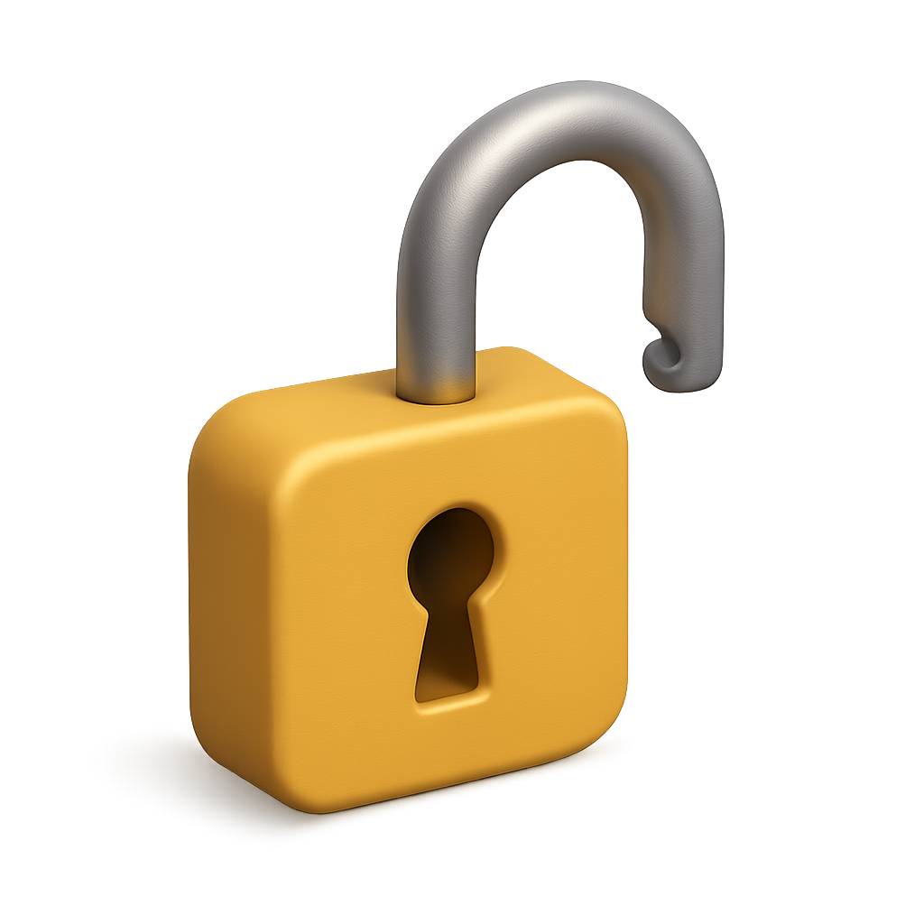 /Collection: /by davooda/Type: PNG/A 3D representation of an open padlock featuring a keyhole. The design showcases a bright yellow body and a metallic silver shackle, viewed from a three-quarter angle.