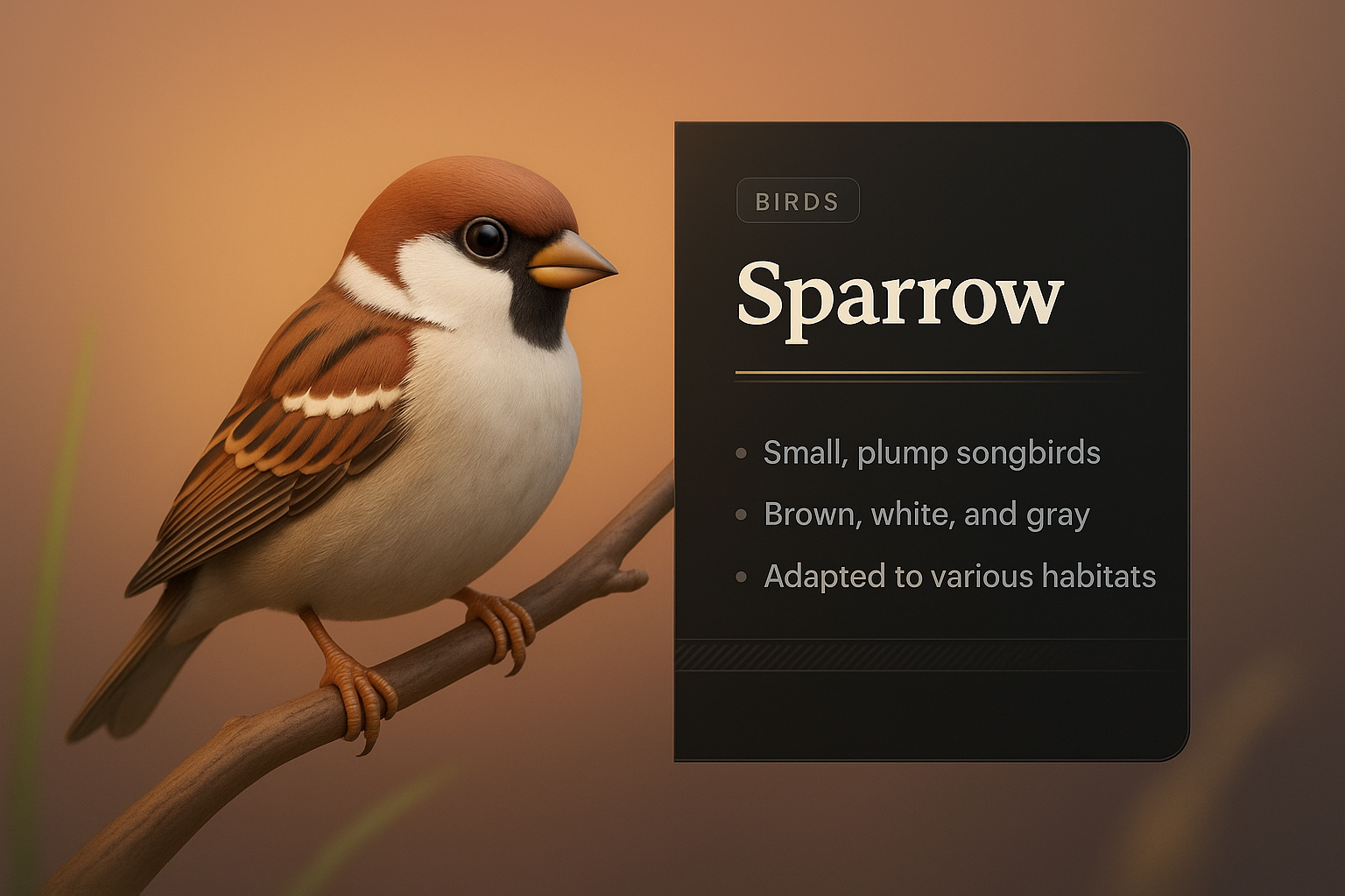 /Collection: /by davooda/Type: PNG/A realistic 3D rendering of a sparrow perched on a branch, accompanied by a dark information block detailing its characteristics and habitats. The background features a smooth gradient.