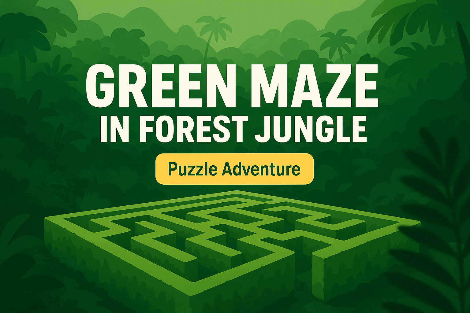 A vibrant graphic depicting a green maze set in a lush forest jungle, designed for a puzzle adventure theme. Ideal for game promotions and family-friendly activities.