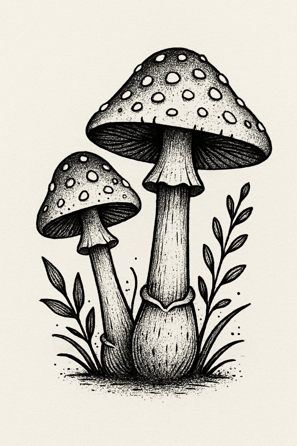 /Collection: /by davooda/Type: PNG/A hand-drawn illustration of two mushrooms surrounded by botanical elements, showcasing intricate details and a monochrome style. Ideal for nature-themed designs and art.