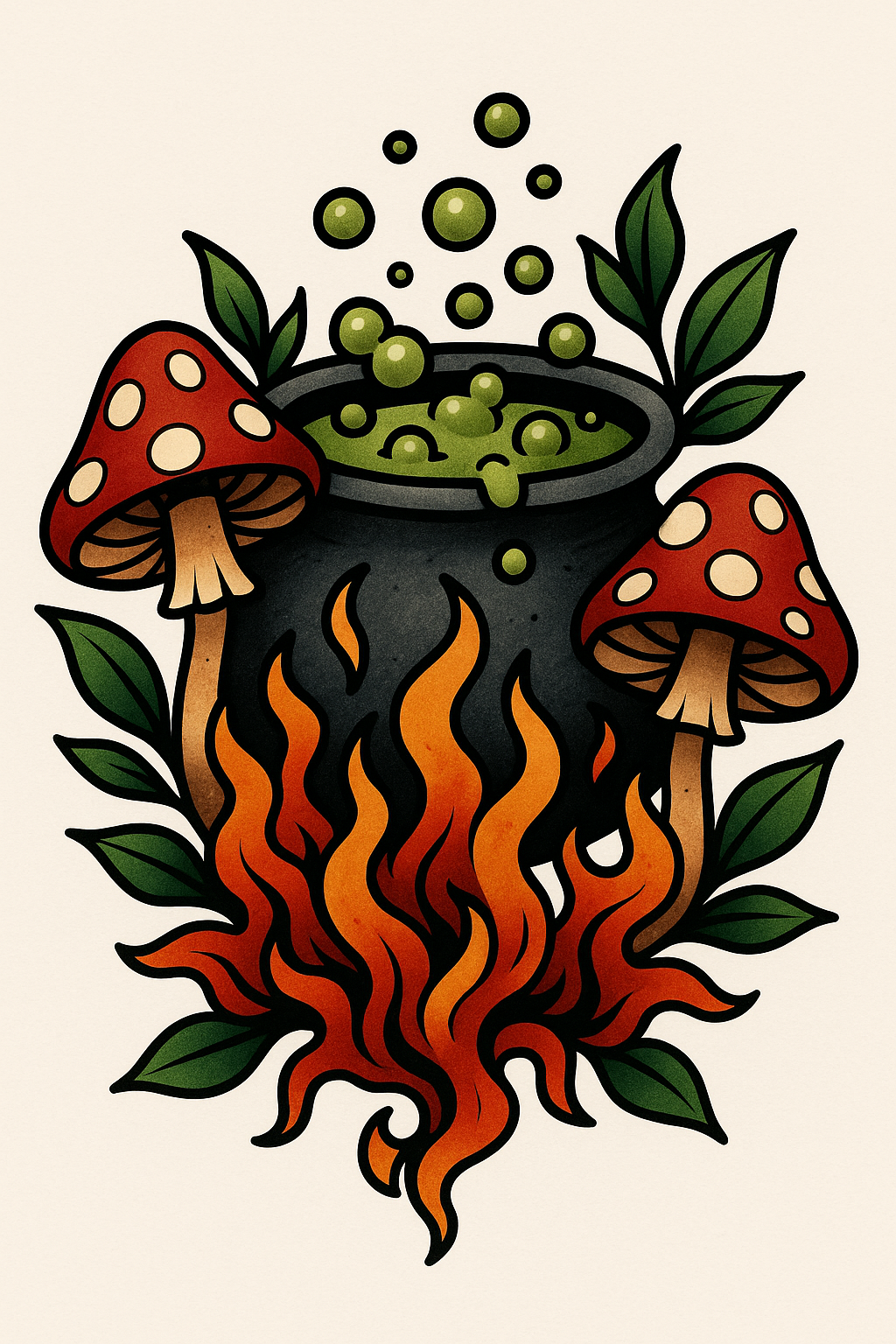 Illustrative Design Featuring a Cauldron and Magical Elements