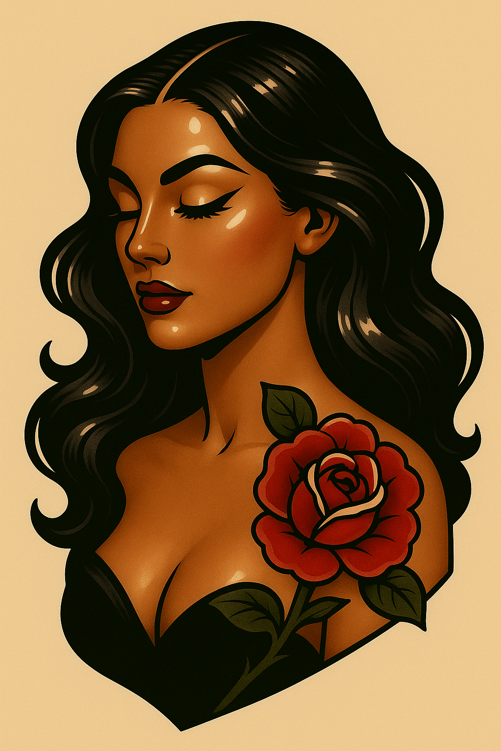 A glossy illustration of a woman with long, flowing hair, featuring a vibrant red rose blooming from her heart. The background is a soft beige, enhancing the tattoo-like quality.