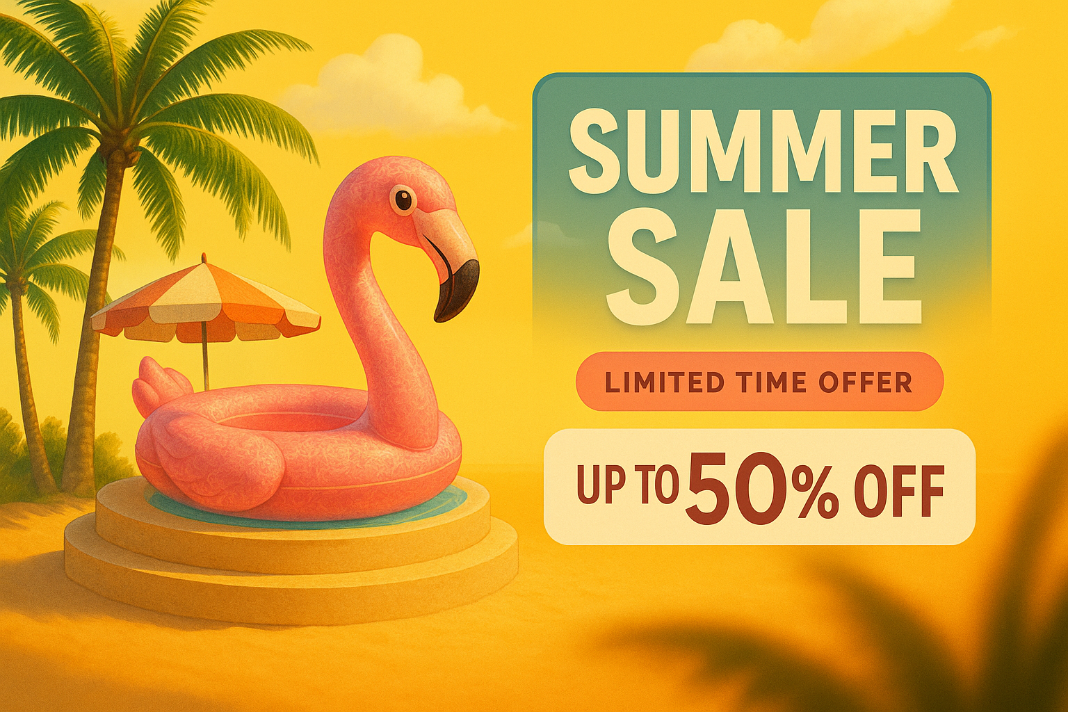 Vibrant Summer Sale Banner Featuring a Flamingo Pool Float
